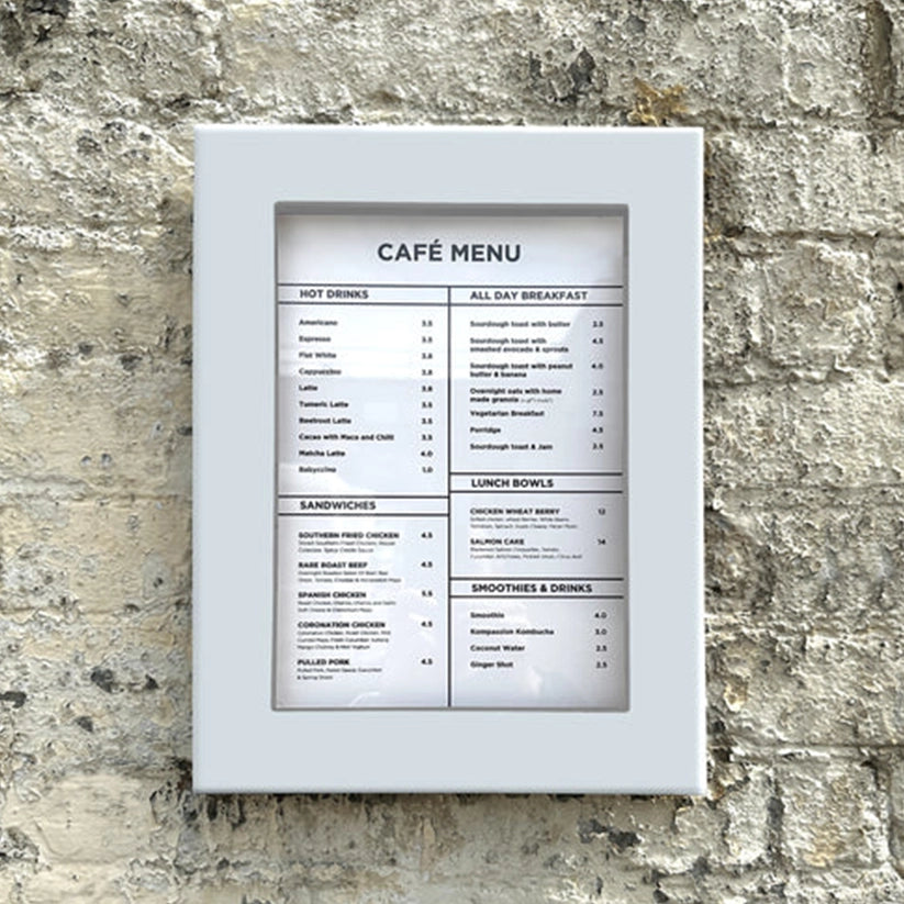 Our slimline menu cases are great for cafés, coffee shops, bars, restaurants and hotels. Fitted with a easily removable front panel, please note this menu case is not lockable, for lockable menu cases please see our other menu case listings.