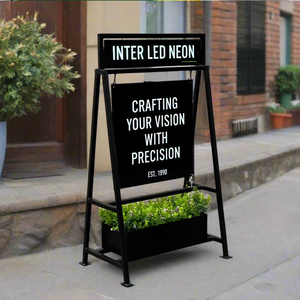 This is 'A' frame is made from welded steel, the metal panels are customised to your design. The planter adds weight to the base and is ready for you to add your own potted plants, (plants shown not included).