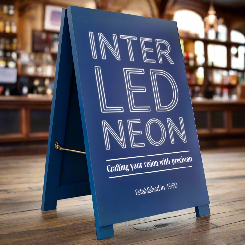 This is our wooden 'A' board or pavement board design, hand crafted and finished in our London workshop. It has a heavy timber frame with heavy duty brass fixings for a robust design.
